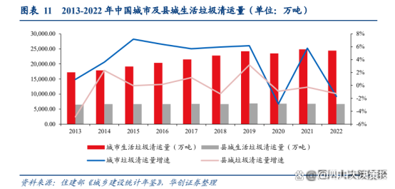 量為 2.44 億噸,并連續(xù)兩年超過 2019 年受影響前的 2.42 億噸,疫情對生活垃圾清運量的負向影響得到緩解。近 10 年我國鄉(xiāng)村生活垃圾處理率不斷提高,根據(jù)《2022 城鄉(xiāng)建設統(tǒng)計年鑒》,農(nóng)村地區(qū)生活垃圾處理率已達 82.99%。相比城市而言,農(nóng)村的垃圾產(chǎn)生規(guī)模和人均垃圾產(chǎn)生量遠遠偏低,同時存在鄉(xiāng)村人口萎縮的情況,但由于農(nóng)村地區(qū)垃圾收集、處置率存在較大的提高空間,依靠對未處理的垃圾存量的消化和擴大處理覆蓋,未來農(nóng)村垃圾處理規(guī)模的擴張可期。