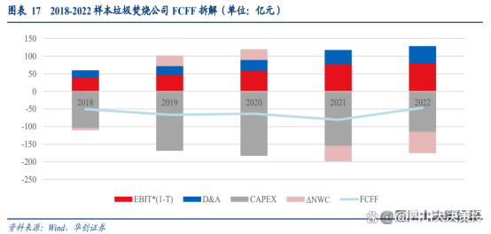 垃圾焚燒行業(yè) FCFF(自由現(xiàn)金流) 拆解。我們選取瀚藍環(huán)境、旺能環(huán)境、上海環(huán)境、中科環(huán)保、軍信股份、綠色動力、城發(fā)環(huán)境和三峰環(huán)境 8 家質(zhì)地較純(垃圾焚燒占營收比重高,暫無明顯第二成長曲線邏輯)的公司作為樣本進行分析:CAPEX 較重,F(xiàn)CFF 尚未轉(zhuǎn)正。垃圾焚燒行業(yè)的固定資產(chǎn)投資較重,據(jù)圖概算,垃 圾焚燒設施的單噸投資成本可達 50 萬元以上,CAPEX 對于 FCFF 的拖累極大,2020 年8 家上市公司的資本開支高達-182 億元,而同期的 EBIT*(1-T)僅為 59 億元。但此后隨著行業(yè)新中標項目數(shù)量的減少,板塊的 CAPEX 也呈現(xiàn)下降趨勢,F(xiàn)CFF 明顯回升To G 生意占比較高,應收賬款拖累營運資本。垃圾焚燒公司的收入主要可以分為垃圾處理費與上網(wǎng)電費,其中垃圾處理費與政府結(jié)算向居民端的順價并不順利,上網(wǎng)電費中標桿電價與國家電網(wǎng)結(jié)算較為及時,國補和省補均存在一定的拖欠。尤其 2020 年后垃圾焚燒電費國補的發(fā)放進度變緩后,ΔNWC 對于 FCFF 的貢獻也由正轉(zhuǎn)負。