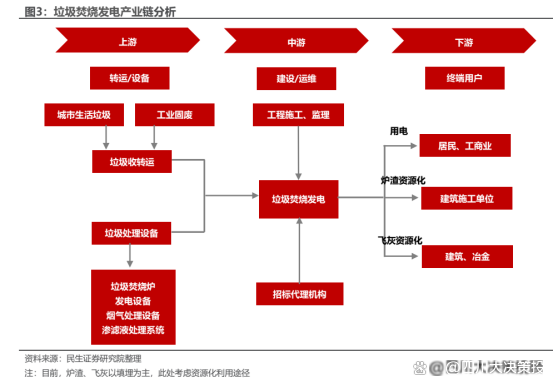 垃圾焚燒發(fā)電企業(yè)上游主要包括環(huán)衛(wèi)服務(收轉(zhuǎn)運)、垃圾處理設備;中游包括以垃圾焚燒發(fā)電廠為核心的相關招標代理、建設、監(jiān)理等機構;下游既包括用電單位(居民、工商業(yè)等),也包括再生資源化產(chǎn)品用戶(建筑業(yè)、冶煉行業(yè)等)。