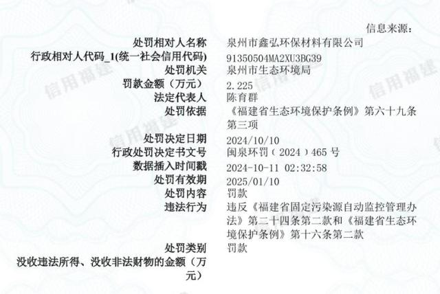 臺海網(wǎng)10月12日訊 根據(jù)泉州市生態(tài)環(huán)境局近日發(fā)布的行政處罰信息公開表(閩泉環(huán)罰(2024)465號)顯示,因當(dāng)事人違反《福建省固定污染源自動監(jiān)控管理辦法》第二十四條第二款和《福建省生態(tài)環(huán)境保護(hù)條例》第十六條第二款,對泉州市鑫弘環(huán)保材料有限公司處以人民幣22250元罰款。