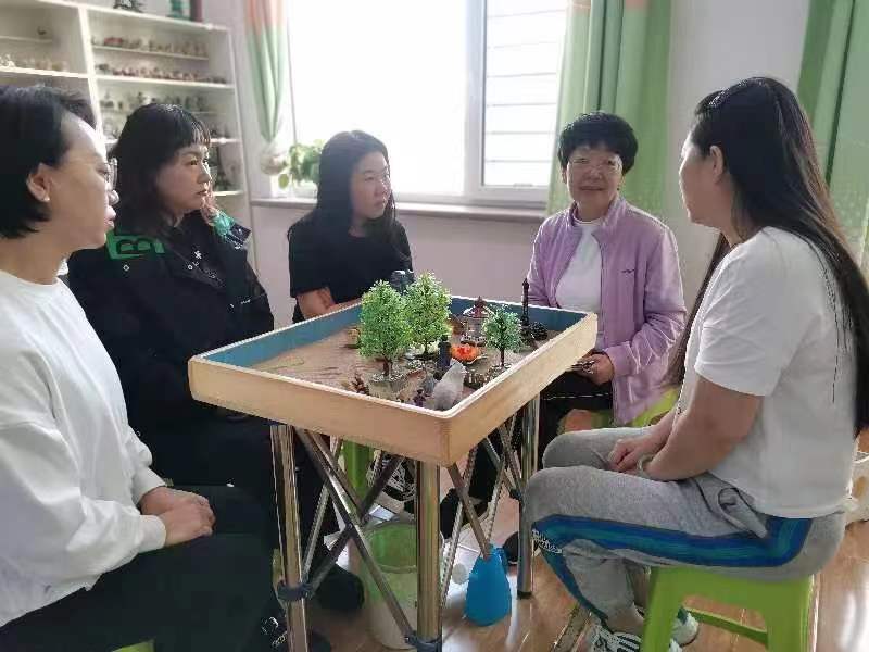沙盤(pán)游戲是通過(guò)沙、沙盤(pán)以及有關(guān)人或物的微縮模型來(lái)進(jìn)行心理治療與心理輔導(dǎo)的手段?;顒?dòng)開(kāi)始前,沙盤(pán)輔導(dǎo)師將大家分成兩組,以小組形式進(jìn)行沙盤(pán)游戲,每個(gè)組員輪流選取沙具,每輪只能選一件,共六輪,選完按照自己心里的意愿組合擺放。每輪擺放完畢小組成員描述自己對(duì)沙盤(pán)世界的感受,其他組員則根據(jù)擺放來(lái)分析投射的故事。