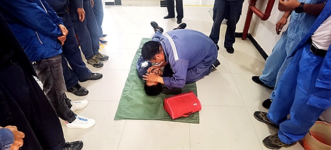 演練模擬大寺鄉(xiāng)發(fā)生6.5級(jí)破壞性地震,供電所辦公樓開始搖晃,指揮長(zhǎng)嚴(yán)世莊大聲呼喊吹哨,各樓層內(nèi)所有人員立即采取正確的避震措施,迅速抱頭尋找最近的墻角、柱角、堅(jiān)固高大的桌下、柜旁或開間小的衛(wèi)生間、內(nèi)承重墻墻角蹲下、抱頭、閉眼,抓牢或握實(shí)以盡量固定身體,使用安全帽等保護(hù)頭部,降低身體重心。隨著指揮長(zhǎng)第二次呼喊緊急撤離,各樓層緊急組織人員安全迅速?gòu)陌踩付ò踩ǖ朗枭⒌街付ň奂c(diǎn),過(guò)程中員工互相呼喚、提醒避震。撤離后清點(diǎn)發(fā)現(xiàn)1人失蹤,急救組立刻對(duì)失蹤人員進(jìn)行搜救,搜救人員在二樓辦公室發(fā)現(xiàn)失蹤人躺在地上,左手臂被傾倒的辦公桌壓住,造成骨折,同時(shí)發(fā)現(xiàn)兩根0.22KV電線(鋁塑線)達(dá)在傷員身上,并正通有電源,傷員無(wú)意識(shí),心跳呼吸停止同時(shí)發(fā)生人員觸電,搜救人員立即斷開有關(guān)電源,用木棒挑開電線,迅速轉(zhuǎn)移傷員至安全地帶后對(duì)其進(jìn)行心肺復(fù)蘇和外傷急救,并撥打120急救電話。經(jīng)全力搶救,傷員已恢復(fù)自主心跳和呼吸,搶救人員對(duì)其進(jìn)行外傷包扎后就地觀察,等待120急救人員到來(lái),同時(shí)有人員報(bào)告一樓安全工器具室發(fā)生火災(zāi),指揮組迅速組織人員對(duì)著火點(diǎn)進(jìn)行滅火器滅火。