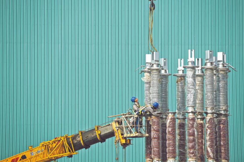 2019年,在張北柔直工程±500千伏康保換流站工程施工現(xiàn)場(chǎng),施工人員吊裝橋臂電抗器?! ∴u明 攝