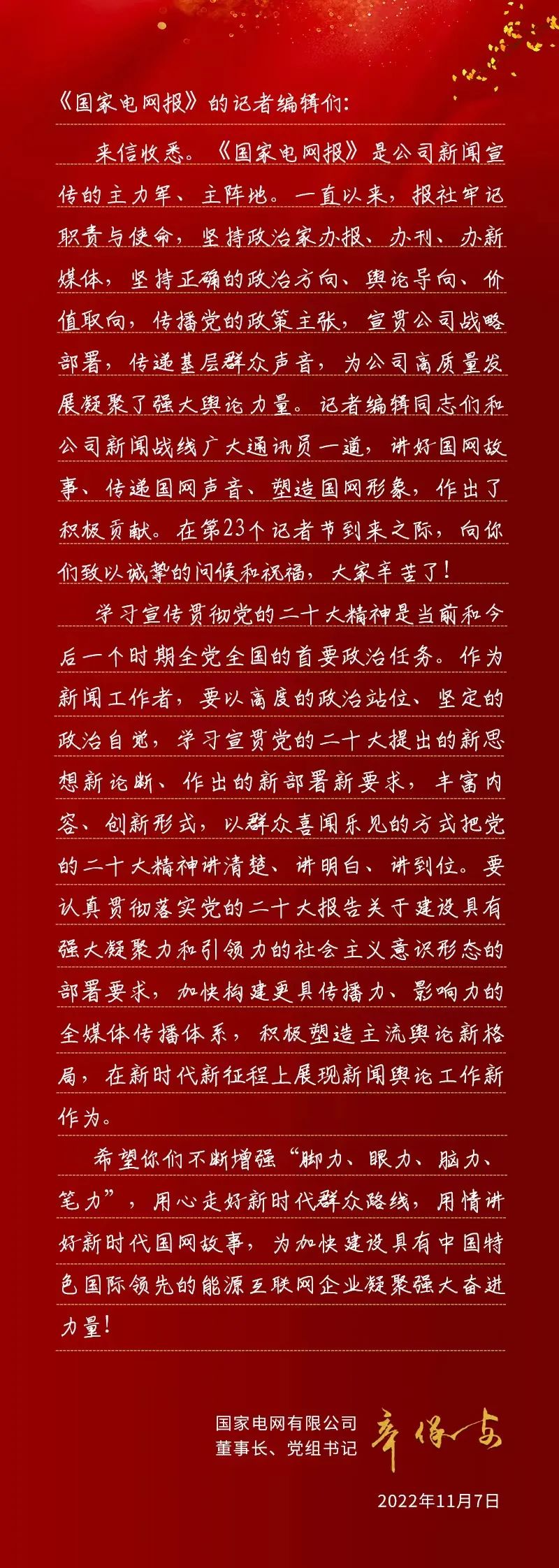 在第23個(gè)中國(guó)記者節(jié)到來之際,11月7日,國(guó)家電網(wǎng)有限公司董事長(zhǎng)、黨組書記辛保安給《國(guó)家電網(wǎng)報(bào)》的記者編輯回信,要求認(rèn)真學(xué)習(xí)宣傳貫徹黨的二十大精神,不斷增強(qiáng)腳力、眼力、腦力、筆力,用心走好新時(shí)代群眾路線,用情講好新時(shí)代國(guó)網(wǎng)故事,為加快建設(shè)具有中國(guó)特色國(guó)際領(lǐng)先的能源互聯(lián)網(wǎng)企業(yè)凝聚強(qiáng)大奮進(jìn)力量。
