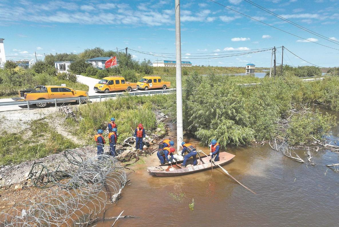 8月14日,黑龍江佳木斯供電公司員工在烏蘇鎮(zhèn)加固10千伏廣場線131號電桿基礎(chǔ),保障線路安全運(yùn)行。吳迪 攝