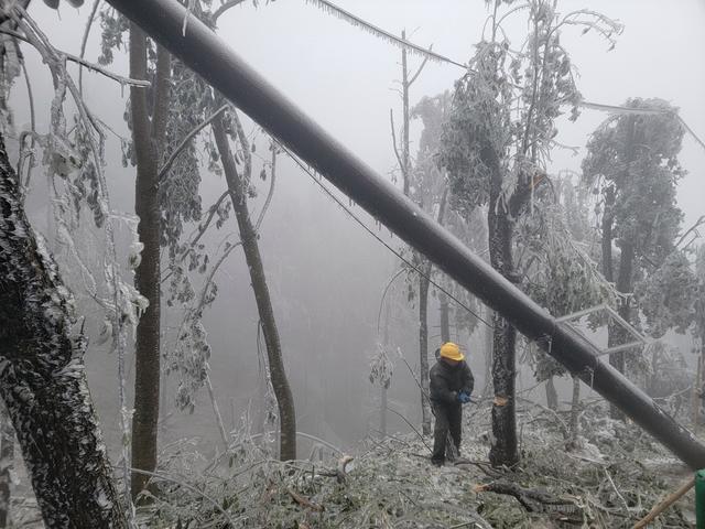 為確保景區(qū)供電需求和游客安全,該公司組織30余名黨員干部職工兵分三路,一邊緊急調(diào)集大功率發(fā)電機(jī)抬運(yùn)至景區(qū),第一時間保障該線路用戶可靠供電,一邊協(xié)同云陽國家森林管理局、茶陵縣消防救援大隊(duì)緊急開展道路疏通搶險(xiǎn),一邊穿冰簾掃障礙,為搶修斷桿線路做準(zhǔn)備。到處是冰碴斷枝的山林里,不斷有晶瑩剔透的冰塊從樹上掉落,搶修人員一邊用柴刀對樹枝進(jìn)行清理,一邊爬冰臥雪艱難前行,清理道路,運(yùn)送桿線搶修物資,在零下冰凍的高山上,分秒必爭地投入到搶修中。