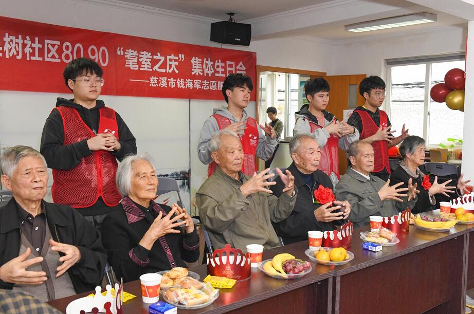 這是慈溪市白果樹社區(qū)第四屆“8090”耄耋老人集體生日會的現(xiàn)場。在重陽節(jié)來臨之際,浙江慈溪市錢海軍志愿服務(wù)中心攜同白果樹社區(qū)和寧波大學(xué)科學(xué)技術(shù)學(xué)院,為社區(qū)內(nèi)30余名80歲以上老人們準(zhǔn)備了蛋糕、壽面和精彩的節(jié)目表演,提前給老人們過一個集體生日。