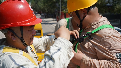 “帶電作業(yè)的方法有三種,分別是中間電位作業(yè)法、地電位作業(yè)法以及等電位作業(yè)法,今天我們采用的中間電位作業(yè)法。今天天氣不錯(cuò),雖然溫度高,但濕度低,能夠滿足帶電作業(yè)條件。帶電作業(yè)必須身著密不透風(fēng)的絕緣套裝,在高溫下,作業(yè)人員體感往往會(huì)達(dá)到60℃。雖然辛苦,但只要能少停電,盡可能的給人民群眾帶去清涼,再苦再累都值得。”帶電作業(yè)班班長(zhǎng)張敏說道。