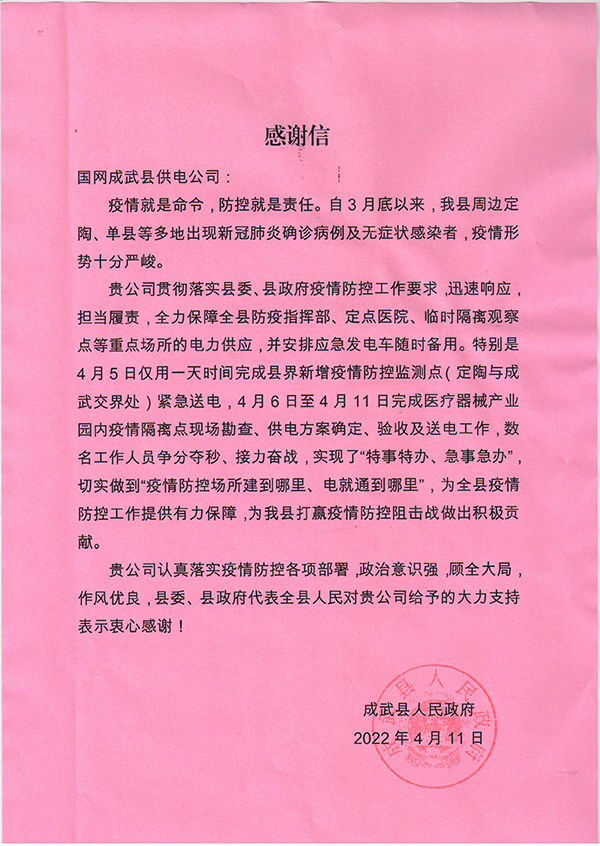 感謝信中說,自3月底以來,疫情形勢十分嚴(yán)峻,成武公司貫徹落實縣委、縣政府疫情防控工作要求,迅速響應(yīng)擔(dān)當(dāng)履責(zé)。工作人員爭分奪秒、接力奮戰(zhàn),實現(xiàn)了“特事特辦、急事急辦”切實做到“疫情防控場所建到哪里、電就通到哪里",全力保障全縣防疫指揮部、定點醫(yī)院、臨時隔離觀察點等重點場所的電力供應(yīng),并安排應(yīng)急發(fā)電車隨時備用,體現(xiàn)了政治意識強,顧全大局的優(yōu)良作風(fēng)。