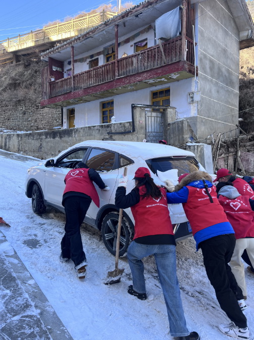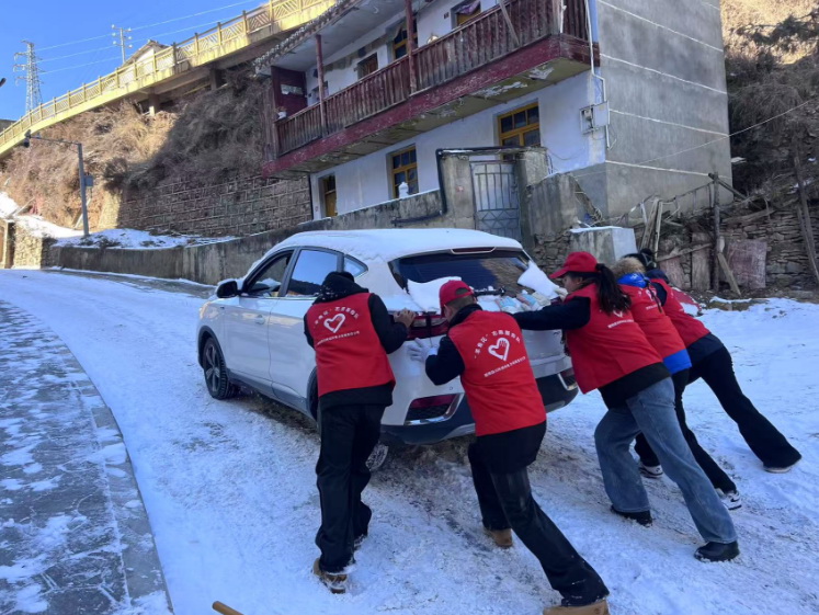 當(dāng)天早上,在德吉巷路,10余名身穿紅馬甲的“羊角花”志愿者分工協(xié)作、互相配合,有的負(fù)責(zé)鏟除厚重的積雪,有的專注清掃路面,確保不留死角。遇到結(jié)冰的地方,志愿者們更是齊心協(xié)力,用鐵鍬一點(diǎn)點(diǎn)破冰,再將碎冰和積雪清理干凈。在除雪過程中,一輛汽車爬坡行駛受路面冰雪影響,車輪不斷打滑,無法前進(jìn)。附近的志愿者們見狀,立刻放下手中工具,迅速趕來幫忙。他們分成兩組,一組在車后用力推動,一組在車前指揮方向,齊聲喊著口號,齊心協(xié)力助力車主解決困難。經(jīng)過近兩小時的共同努力下,道路及兩旁的人行道清理出安全路線,方便群眾出行。
