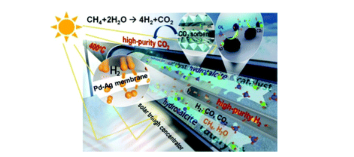 中國科學院工程熱物理研究所首次實現(xiàn)了400°C溫和條件下“凈零排放”的天然氣制氫原理突破。通過有序分離氫氣和二氧化碳產(chǎn)物,天然氣制氫反應(yīng)溫度由傳統(tǒng)的800-1000°C降至400°C以下,實現(xiàn)了99%以上甲烷直接轉(zhuǎn)化為高純氫與高純二氧化碳,并實現(xiàn)了基于化石能源的制氫與脫碳的完全協(xié)同。制氫與脫碳能耗下降幅度達20-40%?;诖耍摴ぷ鹘Y(jié)合商業(yè)化中溫槽式聚光技術(shù),實現(xiàn)了太陽能驅(qū)動的天然氣制氫與脫碳,進一步減少化石能源制氫的碳足跡,展示了化石能源與可再生能源互補實現(xiàn)可持續(xù)氫能利用的可行性。反應(yīng)溫度的降低使工業(yè)余熱與氫能的結(jié)合成為可能。迄今為止,研究人員已完成了超過6000次的穩(wěn)定循環(huán)實驗,驗證了該方法的可靠性,并初步展示了技術(shù)轉(zhuǎn)化應(yīng)用的廣闊前景。