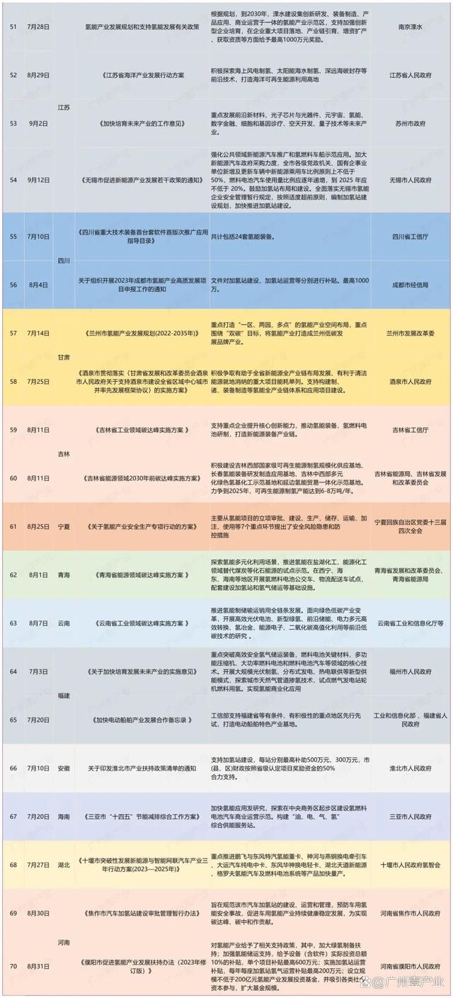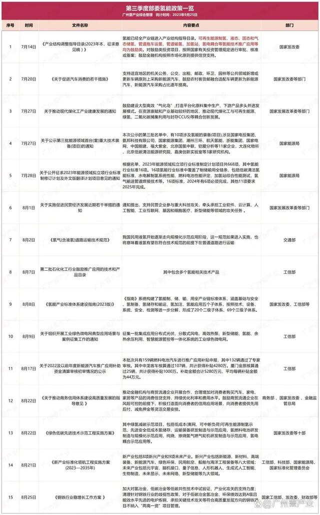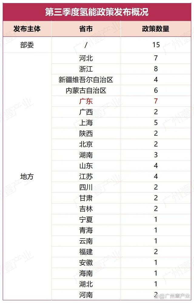 9月17日,浙江省嵊州市人民政府發(fā)布了《關(guān)于加快推進(jìn)新能源裝備產(chǎn)業(yè)高質(zhì)量發(fā)展的實(shí)施意見(jiàn)(征求意見(jiàn)稿)》。其中提到,積極布局發(fā)展氫能產(chǎn)業(yè)。布局發(fā)展氫能“制儲(chǔ)輸用”、氫燃料電池系統(tǒng)等氫能產(chǎn)業(yè)鏈。9月14日,山東省能源局發(fā)布了《關(guān)于開(kāi)展能源綠色低碳轉(zhuǎn)型試點(diǎn)示范建設(shè)工作的通知》。文件中涉及到氫能的內(nèi)容有:鼓勵(lì)發(fā)展風(fēng)電、光伏發(fā)電制氫,培育可再生能源開(kāi)發(fā)利用新模式新業(yè)態(tài);積極推進(jìn)核能海水淡化、核能制氫等研究示范等。9月13日,佛山市人民政府印發(fā)了《佛山市碳達(dá)峰實(shí)施方案》的通知。方案中提到,重點(diǎn)發(fā)展氫能產(chǎn)業(yè)。牽頭推進(jìn)廣東燃料電池汽車(chē)示范應(yīng)用城市群建設(shè),強(qiáng)化城市群內(nèi)各市資源共享、優(yōu)勢(shì)互補(bǔ)。加強(qiáng)氫能基礎(chǔ)設(shè)施建設(shè)。推動(dòng)氫能示范應(yīng)用擴(kuò)面,促進(jìn)氫能產(chǎn)業(yè)要素集聚,培育引進(jìn)優(yōu)勢(shì)骨干企業(yè),實(shí)現(xiàn)氫能產(chǎn)業(yè)強(qiáng)鏈補(bǔ)鏈,打造大灣區(qū)氫能產(chǎn)業(yè)高地。持續(xù)推動(dòng)南海區(qū)“仙湖氫谷”、一汽解放南方新能源汽車(chē)基地等園區(qū)載體建設(shè)。到2025年,培育氫能及燃料電池企業(yè)超過(guò)170家,到2030年,培育氫能及燃料電池企業(yè)超過(guò)200家。......據(jù)廣州壹產(chǎn)業(yè)不完全統(tǒng)計(jì),截至9月25日,今年第三季度(7、8、9月),部委共發(fā)布15條與氫能相關(guān)的政策,地方則有23個(gè)省(市)發(fā)布了70條氫能政策,合計(jì)85條。