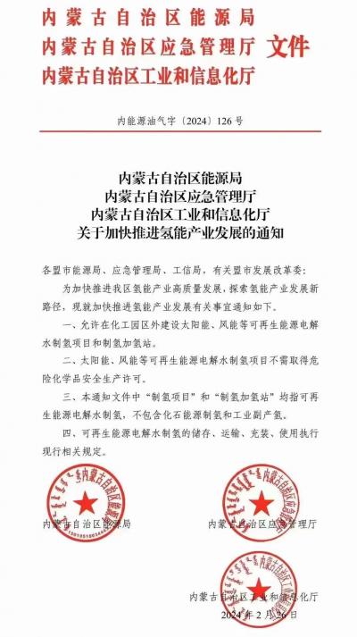 通知明確,允許在化工園區(qū)外建設(shè)太陽能、風(fēng)能等可再生能源電解水制氫項目和制氫加氫站。太陽能、風(fēng)能等可再生能源電解水制氫項目不需取得危險化學(xué)品安全生產(chǎn)許可??稍偕茉措娊馑茪涞膬Υ妗⑦\(yùn)輸、充裝、使用執(zhí)行現(xiàn)行相關(guān)規(guī)定。