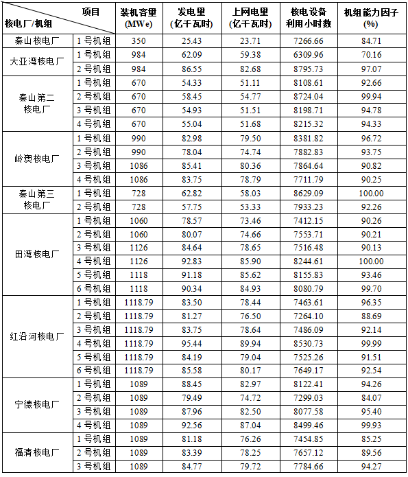 3)本表“合計值/整體值/平均值”中,裝機容量、發(fā)電量、上網電量為各機組合計值,核電設備利用小時數為全部機組整體值,機組能力因子為全部參與統(tǒng)計機組的算數平均值。