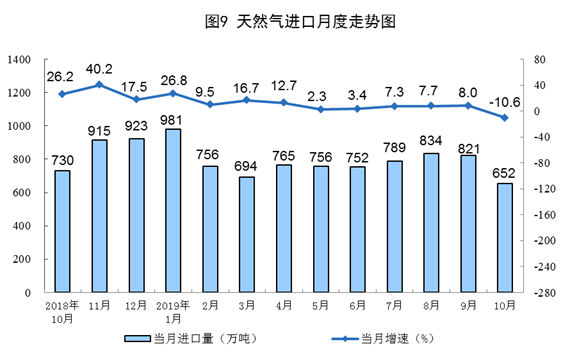 10月份,天然氣進口652萬噸,同比下降10.6%,增速由正轉負,上月為增長8.0%。1—10月份,天然氣進口7771萬噸,同比增長7.9%。