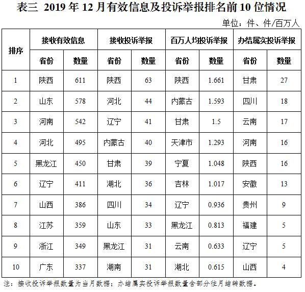 各省(自治區(qū)、直轄市)按照收到的有效信息數(shù)量排序,陜西、山東、河南、河北、黑龍江等列全國前10位;按照投訴舉報數(shù)量排序,陜西、河北、遼寧、內(nèi)蒙古、甘肅等排在全國前10位;按照百萬人均投訴舉報數(shù)量排序,陜西,內(nèi)蒙古,甘肅,天津市,寧夏等排在全國前10位;按照辦結(jié)屬實投訴舉報數(shù)量排序,甘肅、四川、云南、河南、陜西等排在全國前10位。(2019年12月有效信息及投訴舉報排名前10位情況見表三)
