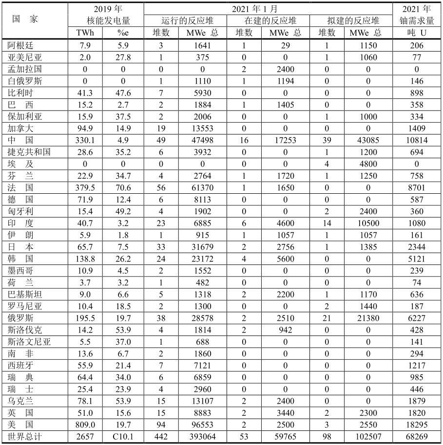 表中“%e”表示核能發(fā)電占發(fā)電總量的百分率。全球核能發(fā)電占全球發(fā)電總量的10.1%,其中法國高達70.6%。本數(shù)據(jù)是世界核能協(xié)會WNA 2021年1月份提供的數(shù)據(jù)。