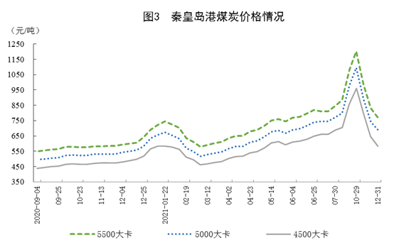 煤炭價格回落。12月31日,秦皇島港5500大卡、5000大卡和4500大卡動力煤綜合交易價格分別為每噸773元、692元和584元,比11月26日分別回落213元、199元和208元。