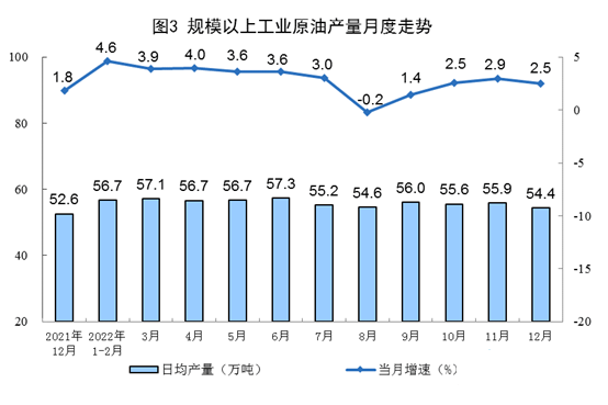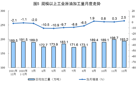 原油加工增速有所加快。12月份,加工原油5988萬噸,同比增長2.5%,增速比上月加快2.2個百分點(diǎn),日均加工193.2萬噸。2022年,加工原油67590萬噸,同比下降3.4%。
