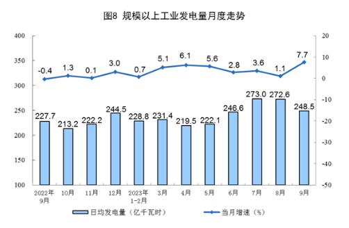 電力生產增速加快。9月份,發(fā)電量7456億千瓦時,同比增長7.7%,增速比8月份加快6.6個百分點,日均發(fā)電248.5億千瓦時。1—9月份,發(fā)電量66219億千瓦時,同比增長4.2%。
