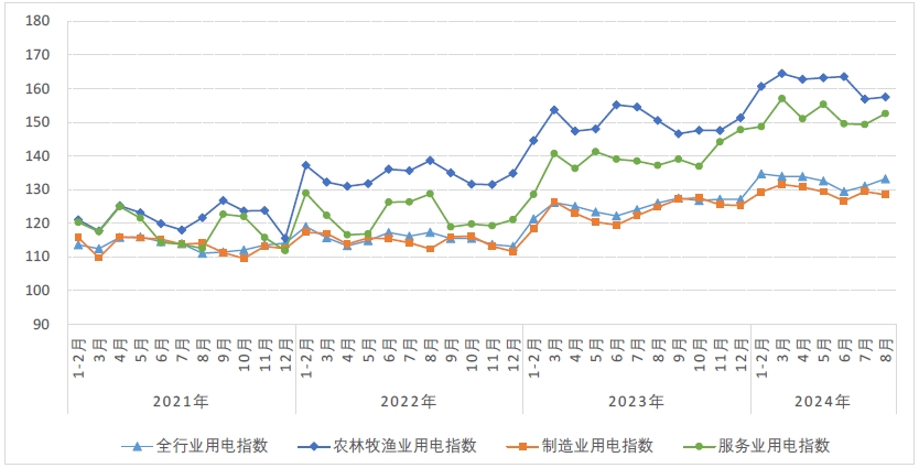 8月,農(nóng)林牧漁業(yè)用電指數(shù)為157.5,比2020年基期增長了57.5%,年均增長12.0%,同比增長4.6%,同比增速比上月回升3.1個(gè)百分點(diǎn)。