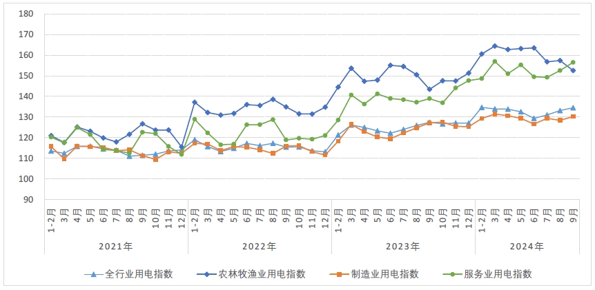 9月,農林牧漁業(yè)用電指數(shù)為152.6,比2020年基期增長了52.6%,年均增長11.1%,同比增長6.4%,同比增速比上月回升1.8個百分點。