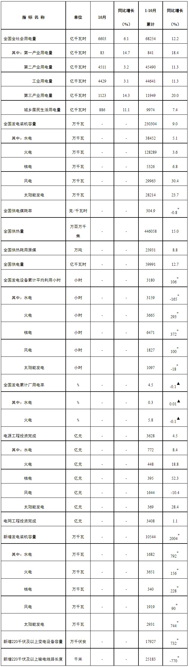 注:1.全社會用電量為全口徑數(shù)據(jù),全國供電量為調(diào)度口徑數(shù)據(jù)。2.“同比增長”列中,標(biāo)*的指標(biāo)為絕對量;標(biāo)▲的指標(biāo)為百分點(diǎn)。