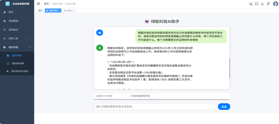 秉持“讓數(shù)據(jù)多跑路、員工少跑腿”理念,綠能科技利用開源大模型平臺(tái)自主部署本地化企業(yè)私有知識(shí)庫智能問答系統(tǒng),并在內(nèi)部投入試運(yùn)行。知識(shí)庫整合海量技術(shù)文檔、科技項(xiàng)目管理文檔、制度文件等材料,通過智能語義檢索提供精準(zhǔn)的工作指引與政策解讀,員工可隨時(shí)通過系統(tǒng)獲取標(biāo)準(zhǔn)化操作規(guī)范,信息查詢效率提升70%,有效消除重復(fù)溝通和無效勞動(dòng)。此外,綠能科技自主開發(fā)的報(bào)表輔助助手先后在生產(chǎn)運(yùn)營中心、電力交易中心投入運(yùn)行。報(bào)表輔助助手運(yùn)用自動(dòng)化算法替代傳統(tǒng)人工數(shù)據(jù)收集、整理與合并,實(shí)現(xiàn)一鍵自動(dòng)生成報(bào)表,報(bào)表處理時(shí)效提升90%,從根本上減輕基層員工報(bào)表壓力,將人力從低效重復(fù)勞動(dòng)中解放出來。