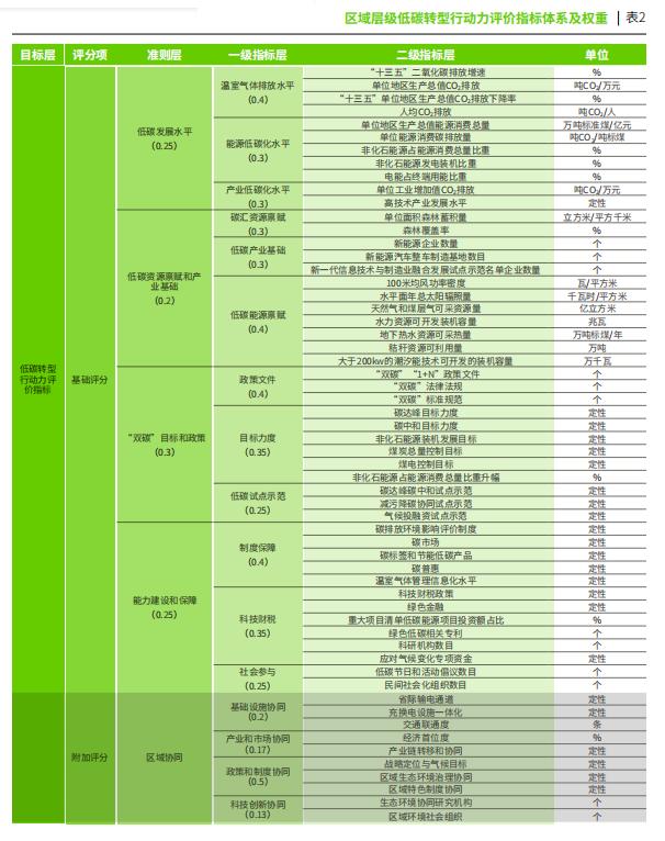 區(qū)域?qū)蛹壍吞嫁D(zhuǎn)型行動力評價指標體系及權重。綠色和平供圖
