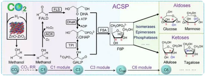 己糖是在自然界廣泛分布、與機(jī)體營(yíng)養(yǎng)代謝最為密切的糖的統(tǒng)稱。迄今為止,人類對(duì)糖的獲取主要依賴于植物類生物質(zhì)資源。然而,這種傳統(tǒng)的“二氧化碳-生物質(zhì)資源-糖”的加工過(guò)程,受到植物光合作用能量轉(zhuǎn)換效率限制;更重要的是,由于土地退化和短缺、生態(tài)系統(tǒng)退化、全球變暖導(dǎo)致的極端天氣和自然災(zāi)害,使依賴于糖類生物質(zhì)資源的生產(chǎn)方式面臨著原料供應(yīng)的安全和風(fēng)險(xiǎn)。