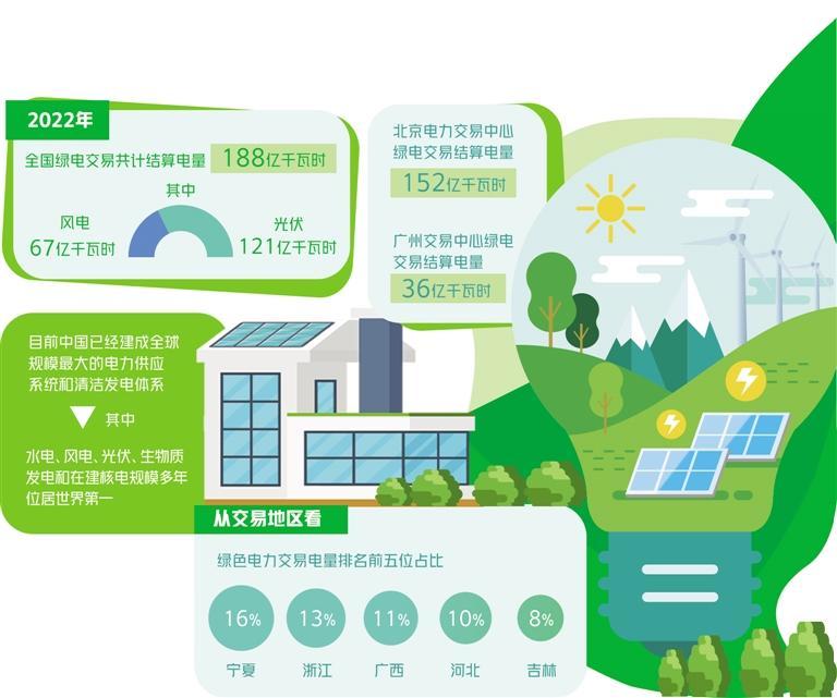 在政策推動下,綠電交易規(guī)模進一步擴大。國網(wǎng)能源研究院數(shù)據(jù)顯示,2022年,全國綠電交易共計結算電量188億千瓦時。其中,風電67億千瓦時,光伏121億千瓦時。北京電力交易中心綠電交易結算電量152億千瓦時,廣州交易中心綠電交易結算電量36億千瓦時。從交易地區(qū)看,綠色電力交易電量排名前五位的是寧夏、浙江、廣西、河北、吉林,占綠色電力交易總電量的16%、13%、11%、10%、8%。