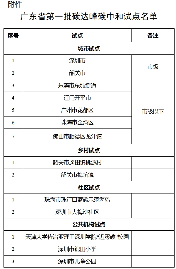 廣東省公布第一批碳達峰碳中和試點公示名單