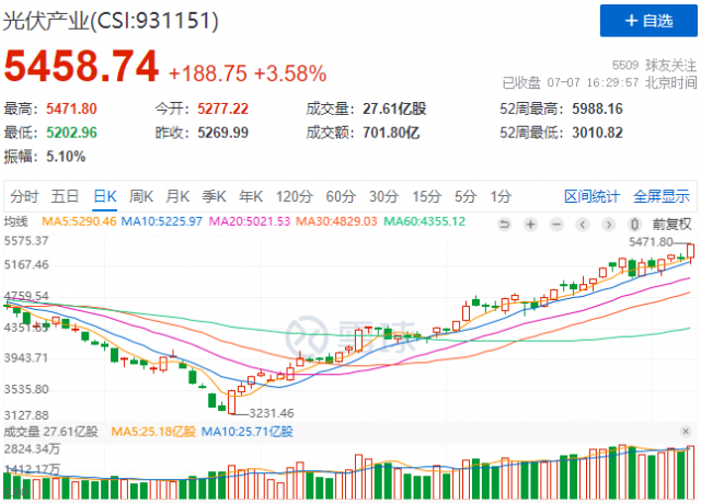 7月7日,光儲(chǔ)逆變器概念股全線暴漲,帶領(lǐng)光伏板塊再創(chuàng)反彈新高!中證光伏產(chǎn)業(yè)指數(shù)(CSI:931151)報(bào)收5459點(diǎn),大漲3.58%!自4月27日低點(diǎn)以來(lái),漲幅高達(dá)69%,大幅跑贏A股市場(chǎng)!