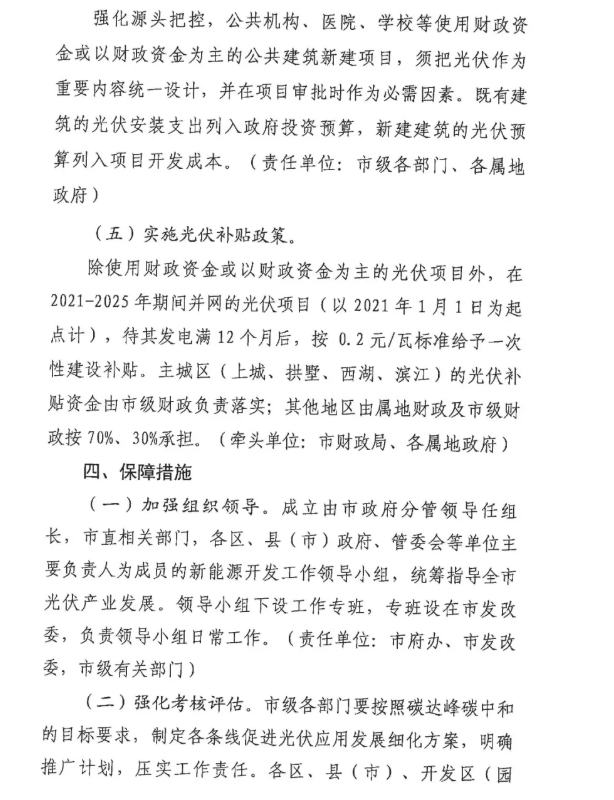 文件提到:除使用財政資金或以財政資金為主的光伏項目外,在2021-2025年期間并網的光伏項目(以2021年1月1日為起點計),待其發(fā)電滿12個月后,按0.2元/瓦標準給予一次性建設補貼。主城區(qū)(上城、拱墅、西湖、濱江)的光伏補貼資金由市級財政負責落實;其他地區(qū)由屬地財政及市級財政按70%、30%承擔。(牽頭單位:市財政局、各屬地政府)