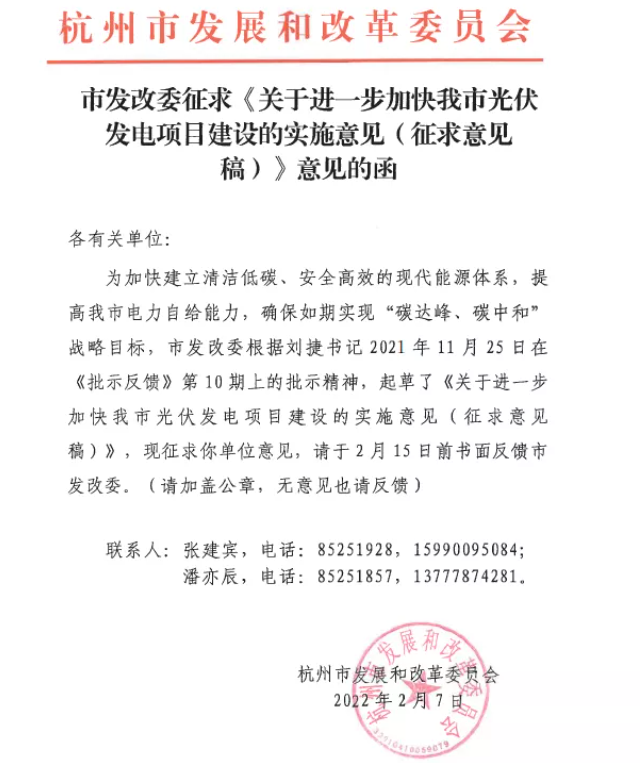 近日,杭州市發(fā)改委發(fā)布了一則關于征求《關于進一步加快我市光伏發(fā)電建設的實施意見(征求意見稿)》意見的函。