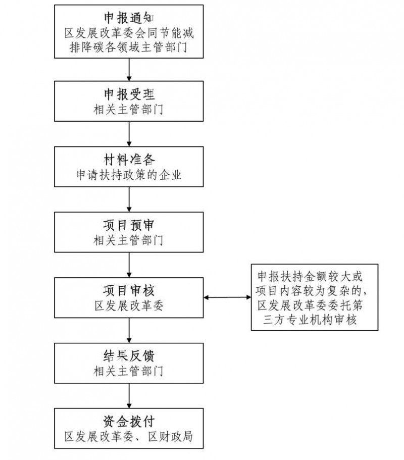 (四)審核審定。各領(lǐng)域主管部門(mén)負(fù)責(zé)扶持項(xiàng)目申請(qǐng)材料的形式審查,提出預(yù)審意見(jiàn)。區(qū)發(fā)展改革委對(duì)項(xiàng)目和扶持金額進(jìn)行審核,其中申報(bào)扶持金額較大或項(xiàng)目?jī)?nèi)容較為復(fù)雜的,由區(qū)發(fā)展改革委安排第三方專(zhuān)業(yè)機(jī)構(gòu)委托評(píng)審。