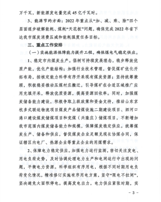 2、能源生產(chǎn)方面:(1)按照現(xiàn)行政策不變的情況下,2022年內(nèi)全市煤炭產(chǎn)量穩(wěn)定在5200萬(wàn)噸左右;各類(lèi)發(fā)電企業(yè)完成發(fā)電量490億千瓦時(shí)左右;(2)貫徹落實(shí)國(guó)家及省市煤電裝機(jī)相關(guān)政策,穩(wěn)步實(shí)施“上大壓小”,2022年煤電裝機(jī)容量穩(wěn)定在1050萬(wàn)千瓦左右;(3)立足濟(jì)寧市資源稟賦實(shí)際,加快新能源開(kāi)發(fā)利用和消納能力提升,力爭(zhēng)2022年底新能源總裝機(jī)實(shí)現(xiàn)350萬(wàn)千瓦,新能源發(fā)電量完成45億千瓦時(shí)。