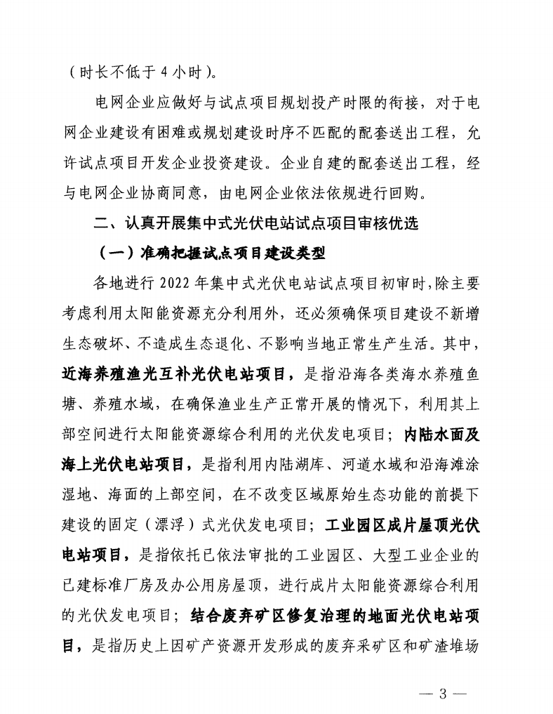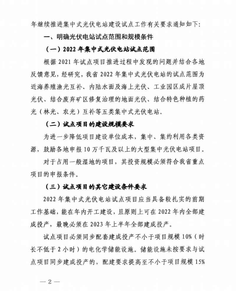 對2022年集中式光伏電站試點項目提出能在年內(nèi)開工建設(shè),且原則上可在2022年內(nèi)全部建成投產(chǎn),最晚必須在2023年上半年全部建成投產(chǎn)的建設(shè)要求。并要求試點項目必須同步配套建成投產(chǎn)不小于項目規(guī)模10%(時長不低于2小時)的電化學(xué)儲能設(shè)施。儲能設(shè)施未按要求與試點項目同步建成投產(chǎn)的,配建要求提高至不小于項目規(guī)模15%(時長不低于4小時)。