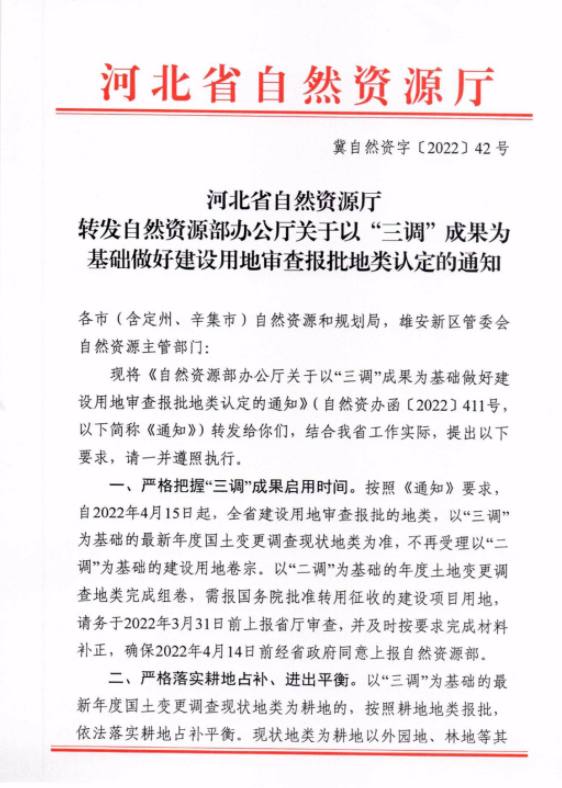 近期,河北省自然資源廳轉(zhuǎn)發(fā)自然資源部辦公廳關(guān)于以“三調(diào)”成果為基礎(chǔ)做好建設(shè)用地審查報(bào)批地類認(rèn)定的通知,按照《通知》要求,自2022年4月15日起,全省建設(shè)用地審查報(bào)批的地類,以“三調(diào)”為基礎(chǔ)的最新年度國土變更調(diào)查現(xiàn)狀地類為準(zhǔn),不再受理以“二調(diào)”為基礎(chǔ)的建設(shè)用地卷宗。