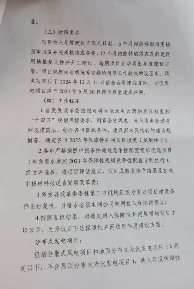 并網時限要求方面文件要求:保障性項目納入年度建設方案之日起,5個月內能夠取得用地預審批復并完成核準或備案,12個月內能夠取得省政府建設用地批復文件并開工建設,逾期項目自動調出年度建設方案,項目規(guī)模由省級統(tǒng)籌安排給前期工作較快的設區(qū)市。風電項目應于2024年12月31日前全容量建成并網,光伏發(fā)電項目應于2024年6月30日前全容量建成并網。