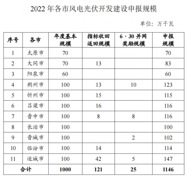 近日,索比光伏網(wǎng)獲悉,山西省能源局印發(fā)《關(guān)于做好2022年風(fēng)電、光伏發(fā)電開(kāi)發(fā)建設(shè)競(jìng)爭(zhēng)性配置有關(guān)事項(xiàng)的通知》(晉能源新能源發(fā)〔2022〕405號(hào)),明確安排風(fēng)電、光伏保障性并網(wǎng)年度規(guī)模1000萬(wàn)千瓦,獎(jiǎng)勵(lì)規(guī)模146萬(wàn)千瓦。