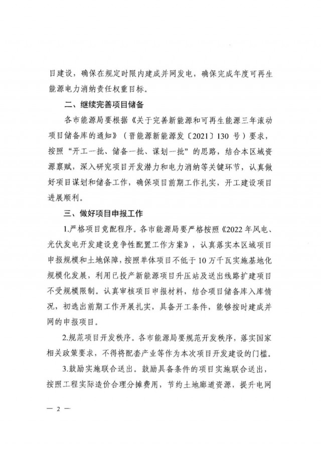 《通知》要求,各市能源局要嚴(yán)格按照《2022年風(fēng)電、光伏發(fā)電開(kāi)發(fā)建設(shè)競(jìng)爭(zhēng)性配置工作方案》,認(rèn)真落實(shí)本區(qū)域項(xiàng)目申報(bào)規(guī)模和土地保障,按照單體項(xiàng)目不低于10萬(wàn)千瓦實(shí)施基地化規(guī)?;l(fā)展,利用已投產(chǎn)新能源項(xiàng)目升壓站及送出線(xiàn)路擴(kuò)建項(xiàng)目不受規(guī)模限制。同時(shí),規(guī)范項(xiàng)目開(kāi)發(fā)秩序,落實(shí)國(guó)家相關(guān)政策要求,不得將配套產(chǎn)業(yè)等作為本次項(xiàng)目開(kāi)發(fā)建設(shè)的門(mén)檻。此外,鼓勵(lì)具備條件的項(xiàng)目實(shí)施聯(lián)合送出,按照工程實(shí)際造價(jià)合理分?jǐn)傎M(fèi)用,節(jié)約土地廊道資源,提升電網(wǎng)資源利用率。