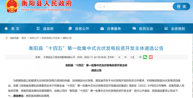 11月22日,湖南省衡陽(yáng)縣“十四五”第一批集中式光伏發(fā)電投資開(kāi)發(fā)主體遴選公告發(fā)布。