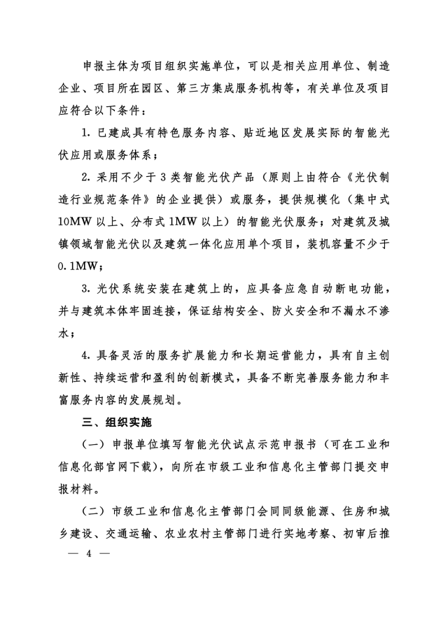 11月24日,河南省工信廳、發(fā)改委、住建廳、交通廳、農(nóng)業(yè)廳等聯(lián)合下發(fā)《關(guān)于組織申報(bào)第三批智能光伏試點(diǎn)示范的通知》,對(duì)示范企業(yè)、示范項(xiàng)目予以支持,包括: