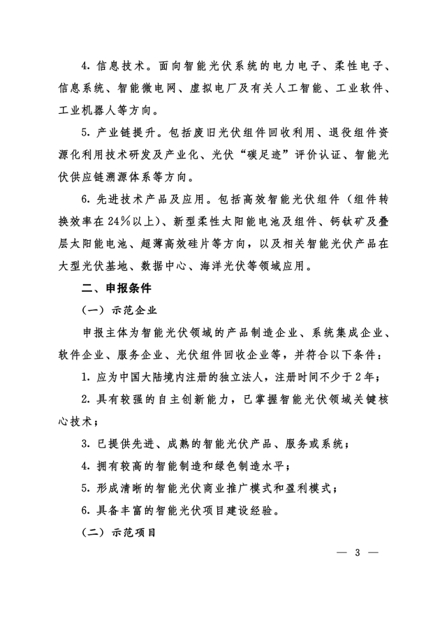 6.先進(jìn)技術(shù)產(chǎn)品及應(yīng)用。包括高效智能光伏組件(組件轉(zhuǎn)換效率在24%以上)、新型柔性太陽(yáng)能電池及組件、鈣鈦礦及疊層太陽(yáng)能電池、超薄高效硅片等方向,以及相關(guān)智能光伏產(chǎn)品在大型光伏基地、數(shù)據(jù)中心、海洋光伏等領(lǐng)域應(yīng)用。