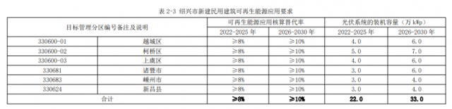 12月26日,紹興市建設局公示《紹興市綠色建筑專項規(guī)劃(2022-2030)(草案)》,其中提到,新建民用建筑(農(nóng)民自建住宅除外),應當按照國家和省有關標準利用可再生能源。可再生能源利用設施應當與建筑主體一體化設計,同步施工、同步驗收。新建民用建筑應采用可再生能源系統(tǒng),應配置太陽能系統(tǒng),滿足浙江省工程建設標準《民用建筑可再生能源應用核算標準》的要求。 至2025 年,紹興市各縣(市、區(qū))新建民用建筑可再生能源應用核算替代率達到 8%,太陽能光伏系統(tǒng)的裝機容量達到 22.0 萬 kWp。至 2030 年,紹興市各縣(市、區(qū))新建民用建筑可再生能源應用核算替代率達到 10%,太陽能光伏系統(tǒng)的裝機容量達到 33.0 萬 kWp。