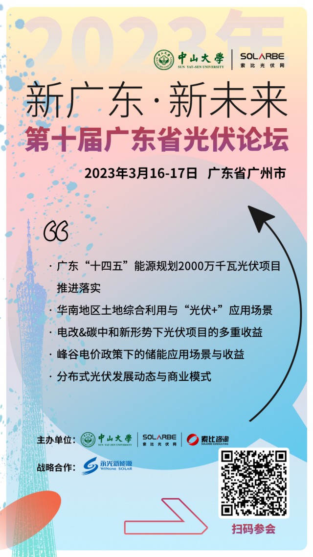 新廣東 新未來(lái)!第十屆廣東省光伏論壇 3月16-17日 聚首廣州,為時(shí)代籌謀!分布式光伏重心南遷之際與各位同仁一起搶占先機(jī)、贏得主動(dòng)!趕緊點(diǎn)擊了解詳情報(bào)名吧!