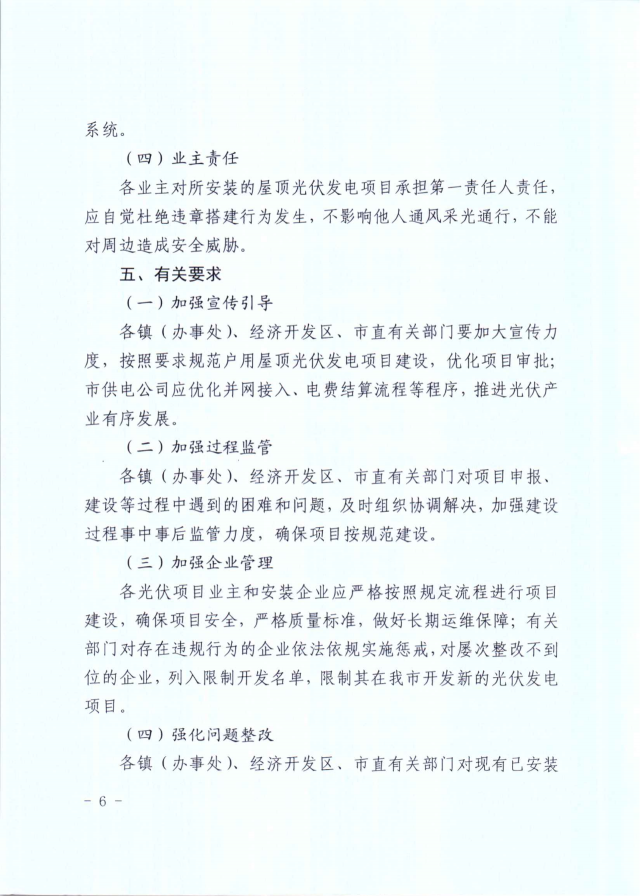 屋頂光伏在組件安裝完成后,業(yè)主需向?qū)俚劓?zhèn)、經(jīng)濟開發(fā)區(qū)提出驗收申請,然后會同市發(fā)改局、自然資源和規(guī)劃局、住建局、市場監(jiān)管局、城管執(zhí)法局、應(yīng)急管理局、供電公司等部門聯(lián)合驗收并出具驗收意見。