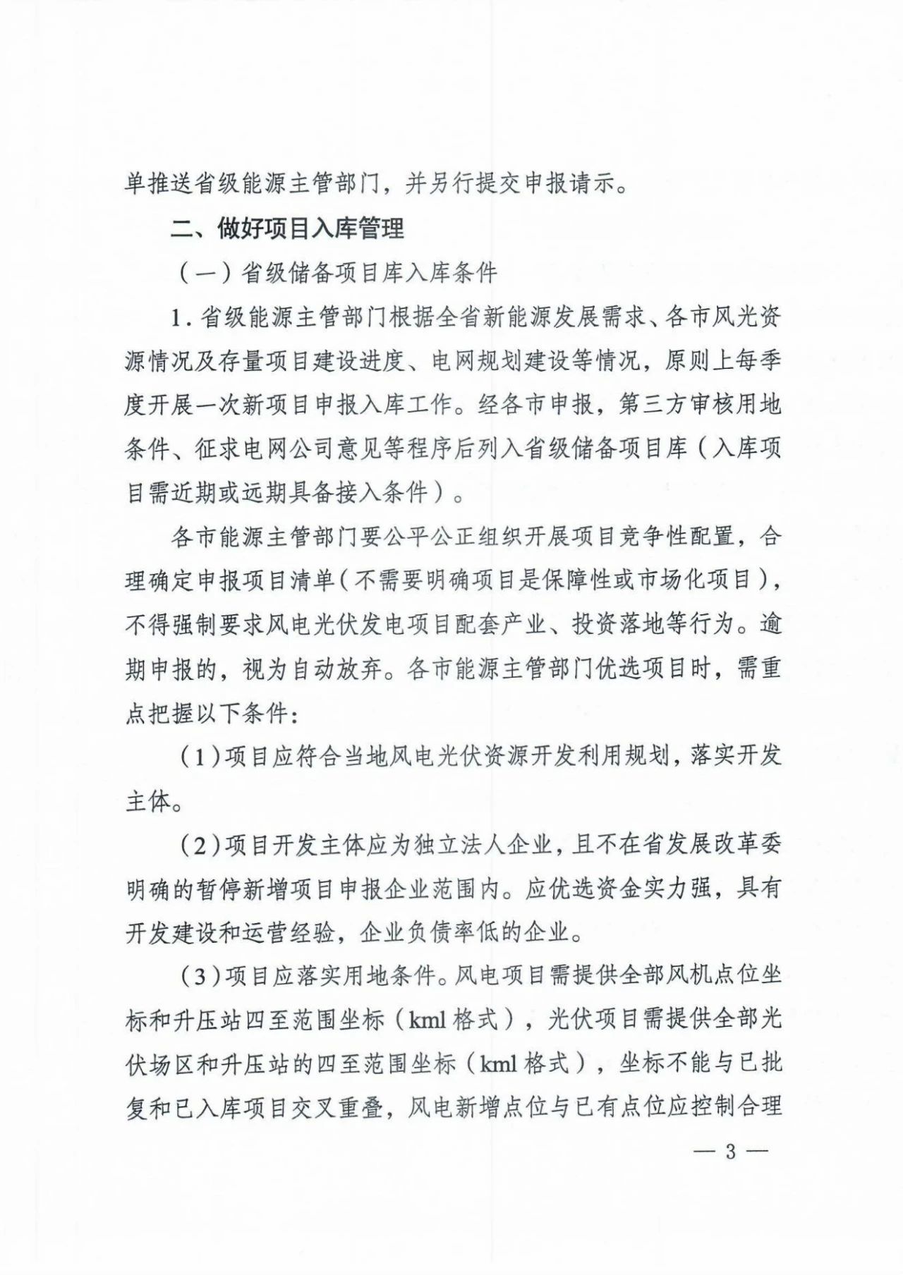 各市需公平開展項(xiàng)目競(jìng)配,無需確定項(xiàng)目類型,但不得強(qiáng)制要求產(chǎn)業(yè)配套、投資落地等。項(xiàng)目應(yīng)落實(shí)用地條件,風(fēng)電項(xiàng)目需提供全部風(fēng)機(jī)點(diǎn)位坐標(biāo)和升壓站四至范圍坐標(biāo)(kml格式),光伏項(xiàng)目需提供全部光伏場(chǎng)區(qū)和升壓站的四至范圍坐標(biāo)(kml格式),坐標(biāo)不能與已批復(fù)和已入庫(kù)項(xiàng)目交叉重疊。項(xiàng)目應(yīng)承諾按要求配置儲(chǔ)能等調(diào)峰設(shè)施,入庫(kù)時(shí)不需要明確配置比例,出庫(kù)時(shí)按當(dāng)年開發(fā)建設(shè)方案要求配置儲(chǔ)能。
