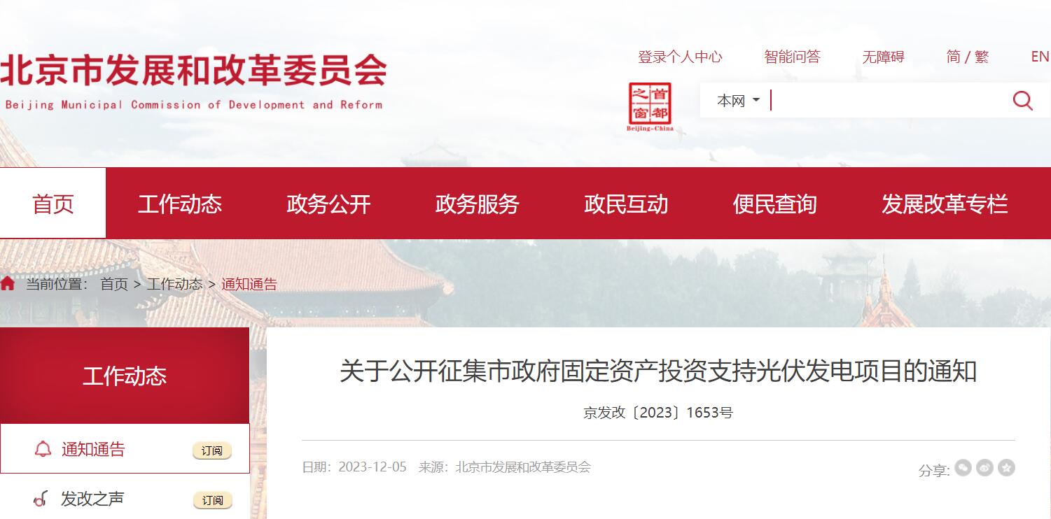 北京市發(fā)展和改革委員會(huì)關(guān)于公開征集市政府固定資產(chǎn)投資支持光伏發(fā)電項(xiàng)目的通知